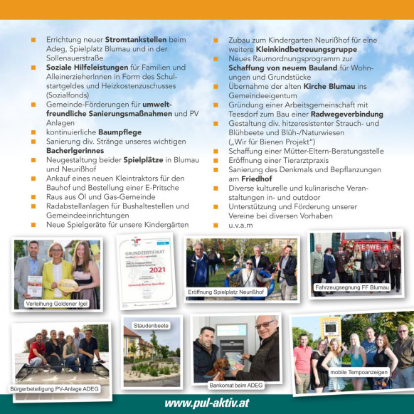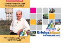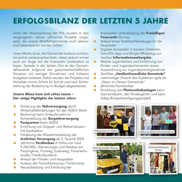 Erinnern Sie sich noch an unsere Wahlprogramme von 2005 und 2015? Hier bringen wir Ihnen aus unseren Programmen die umgesetzten und natürlich auch die nicht umgesetzten Programmpunkte zur Kenntnis. Mit Stolz wollen wir darauf hinweisen, dass es uns gelungen ist fast 95% unserer Zukunftsprogramme tatsächlich umzusetzen. Es ist uns auch gelungen einige große Projekte die nicht vorgesehen waren umzusetzen.